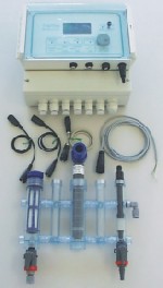 Absperrhähnen, Schlauchanschlussnippel und 10 m Messwasserleitung, je 1 PH- und Redox-Einstalmesskette, 1 Chlormesszelle Cl.4.1 – amperiometrisches Verfahren mit Elektrolyt und Spezialschmirgel,